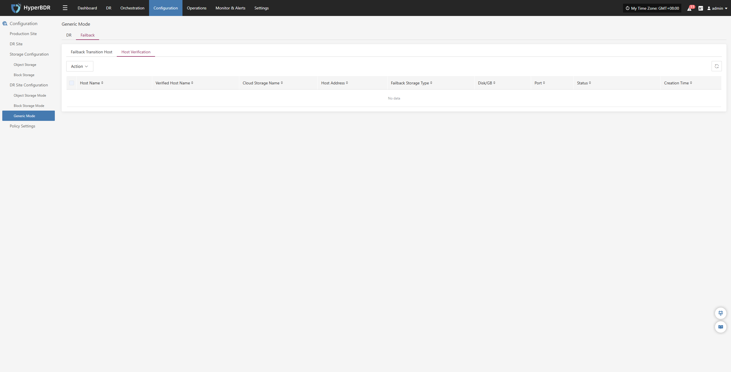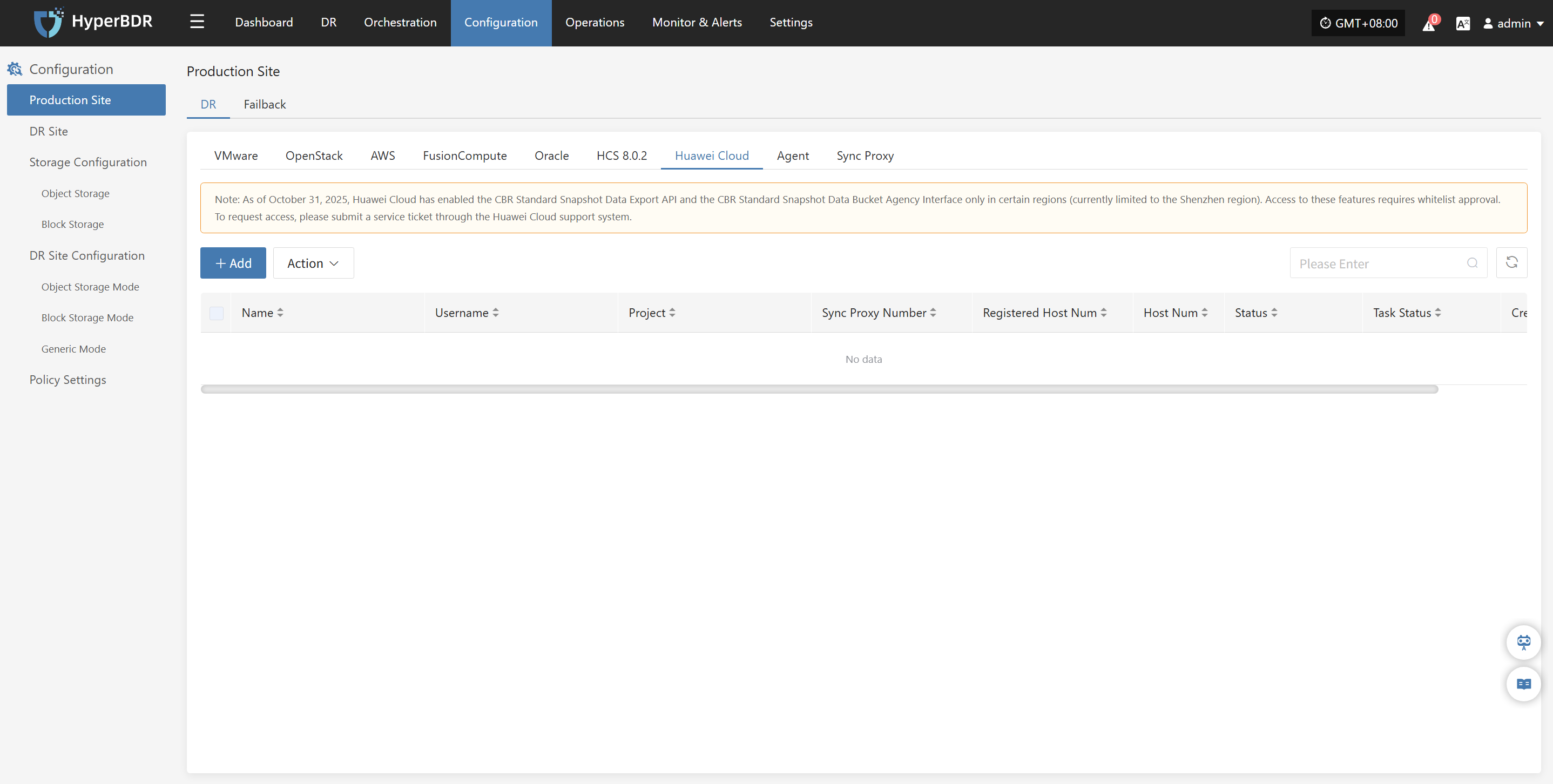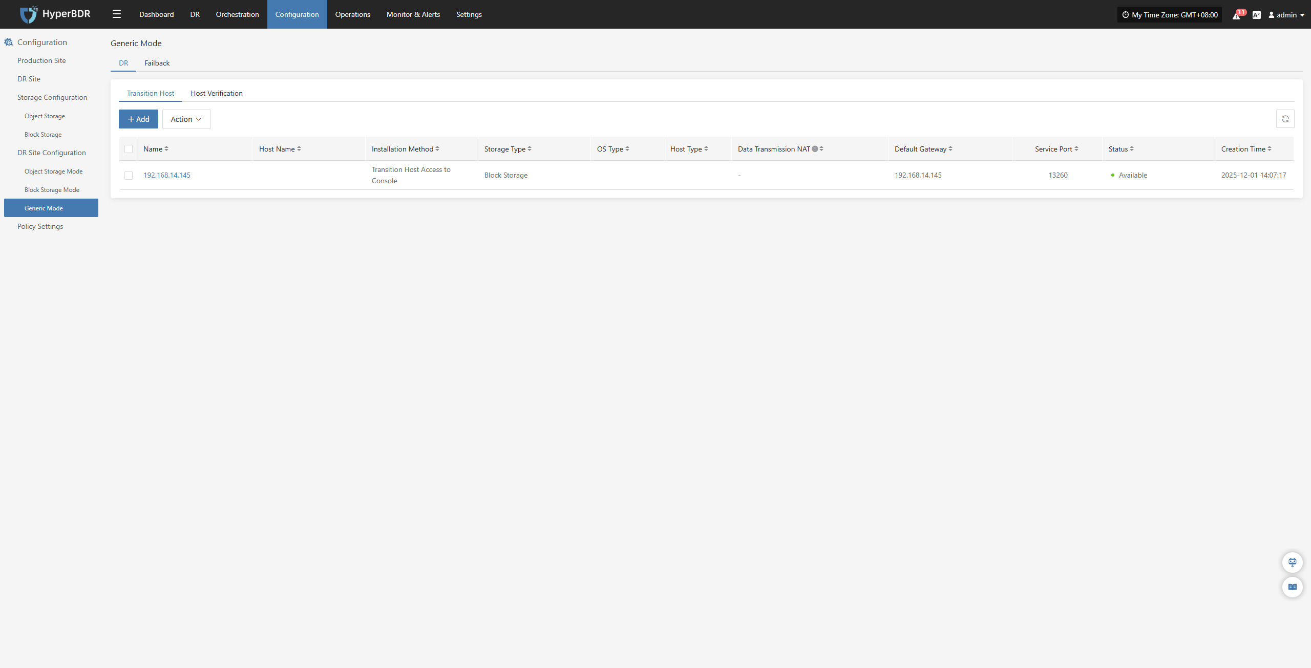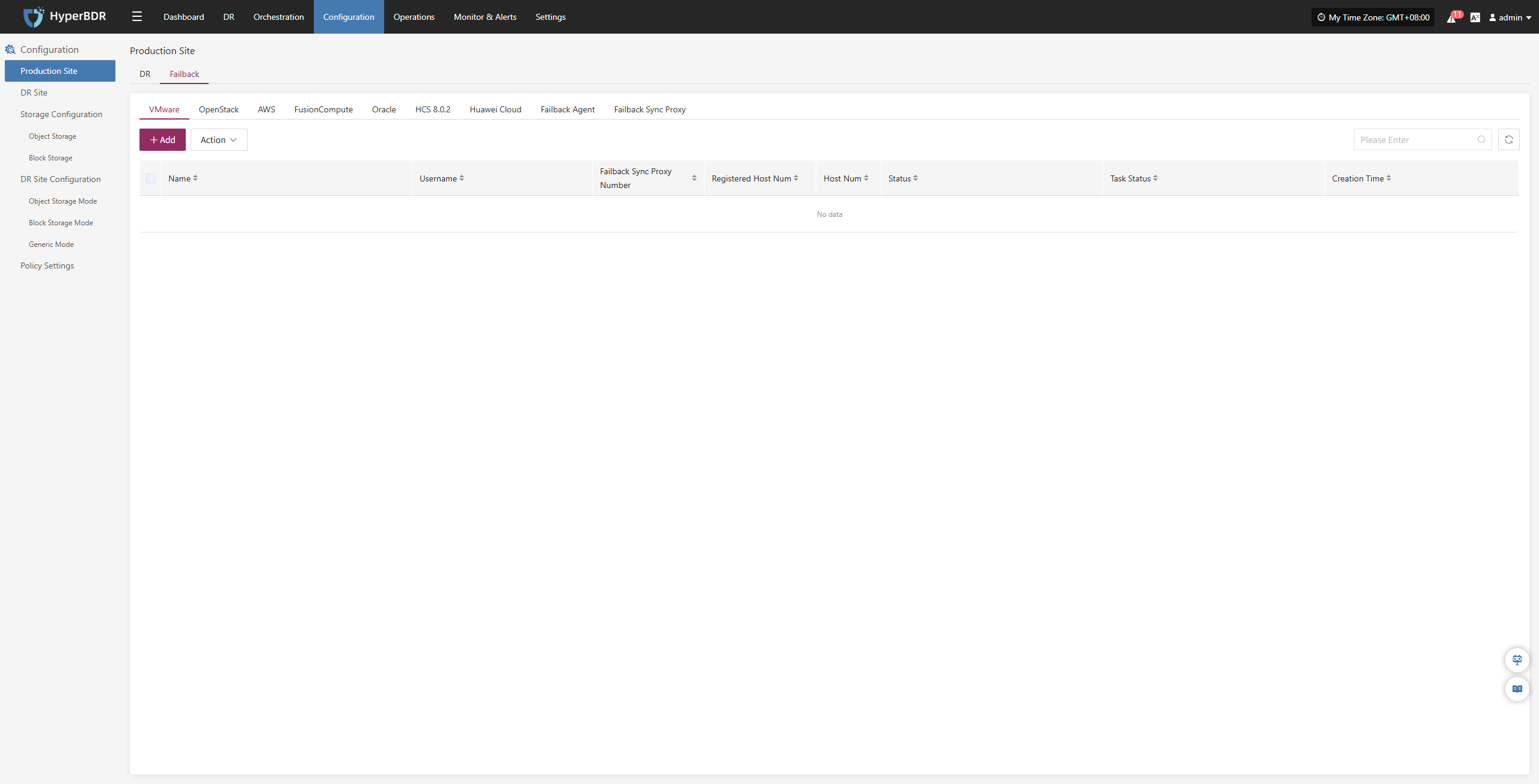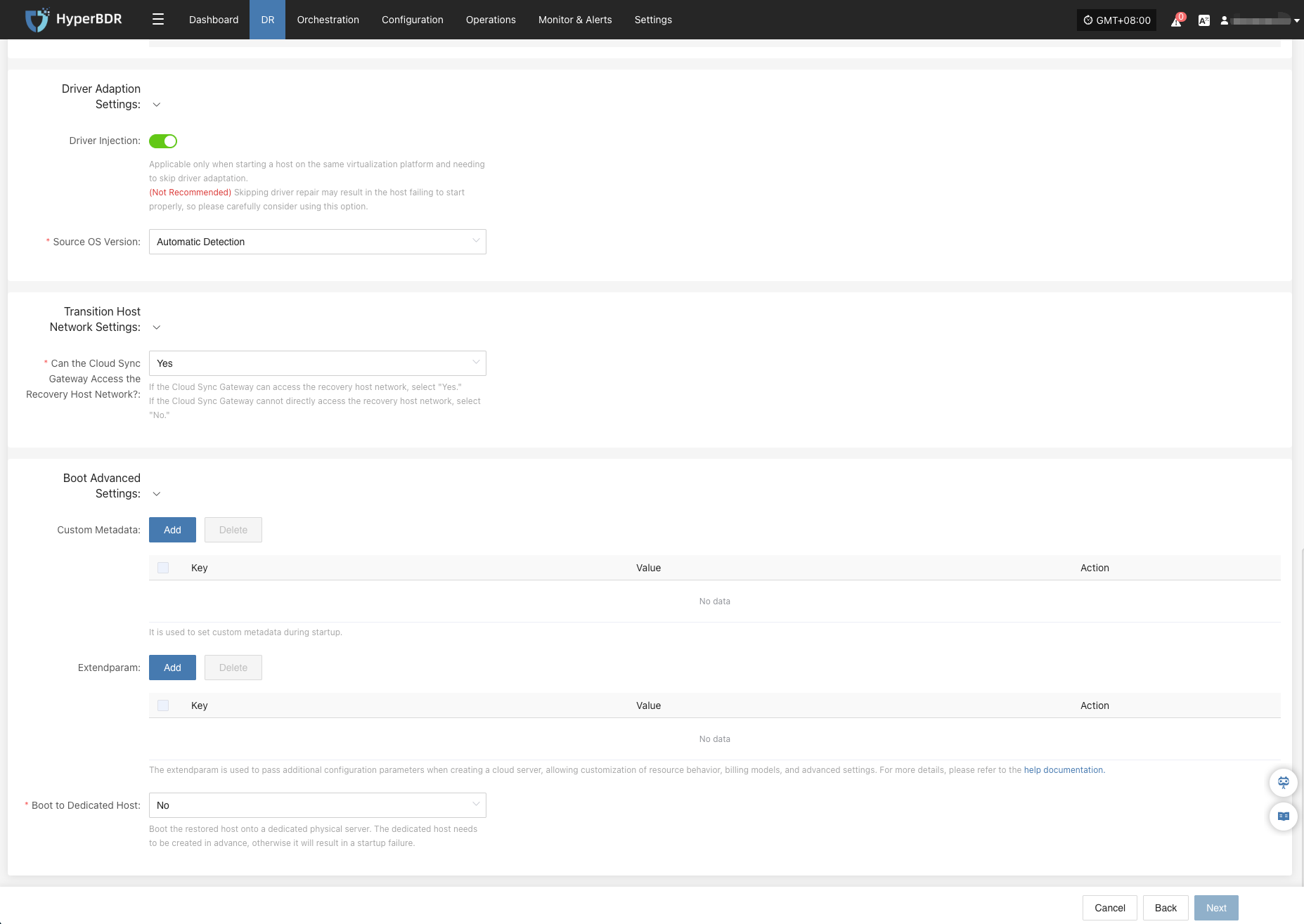 The top navigation bar provides quick access to the main system modules, including: Dashboard, DR, Orchestration, Configuration, Operations, Monitor & Alerts, Settings.
