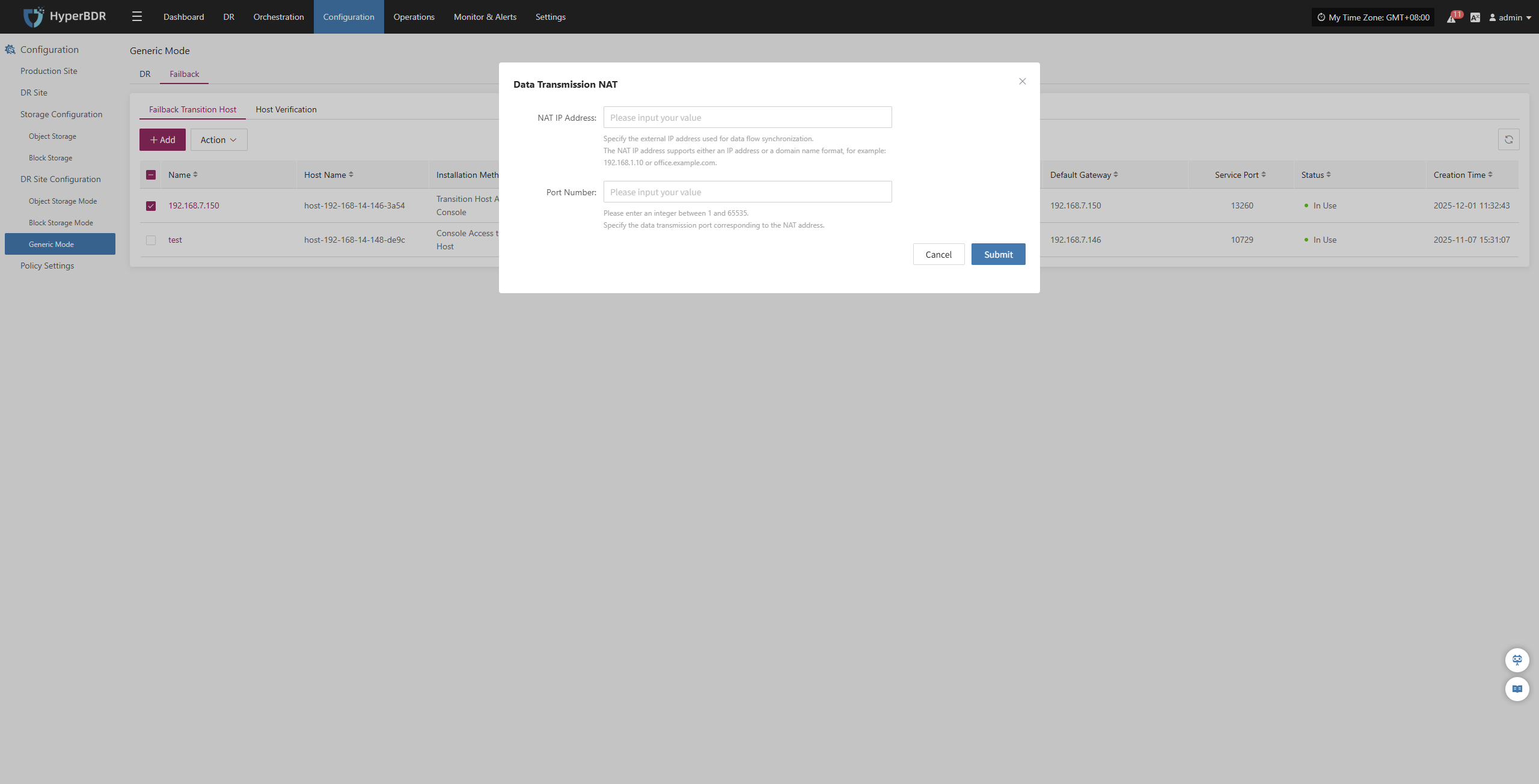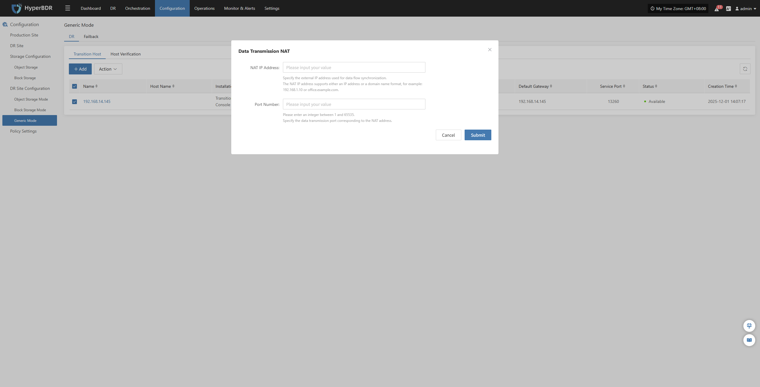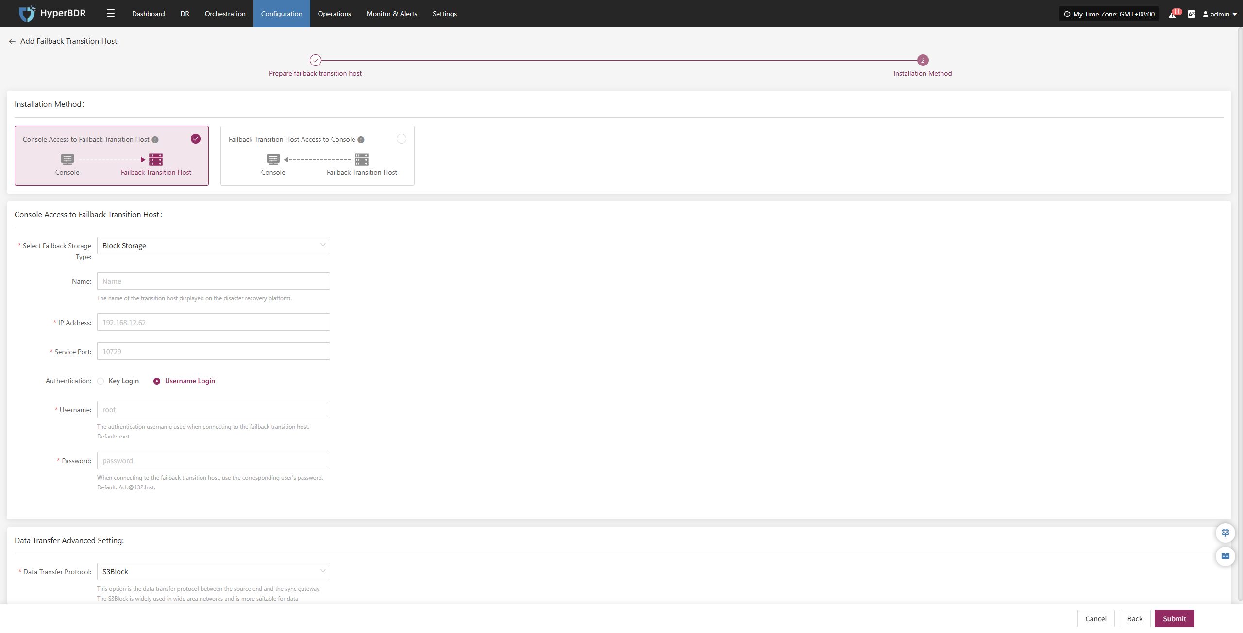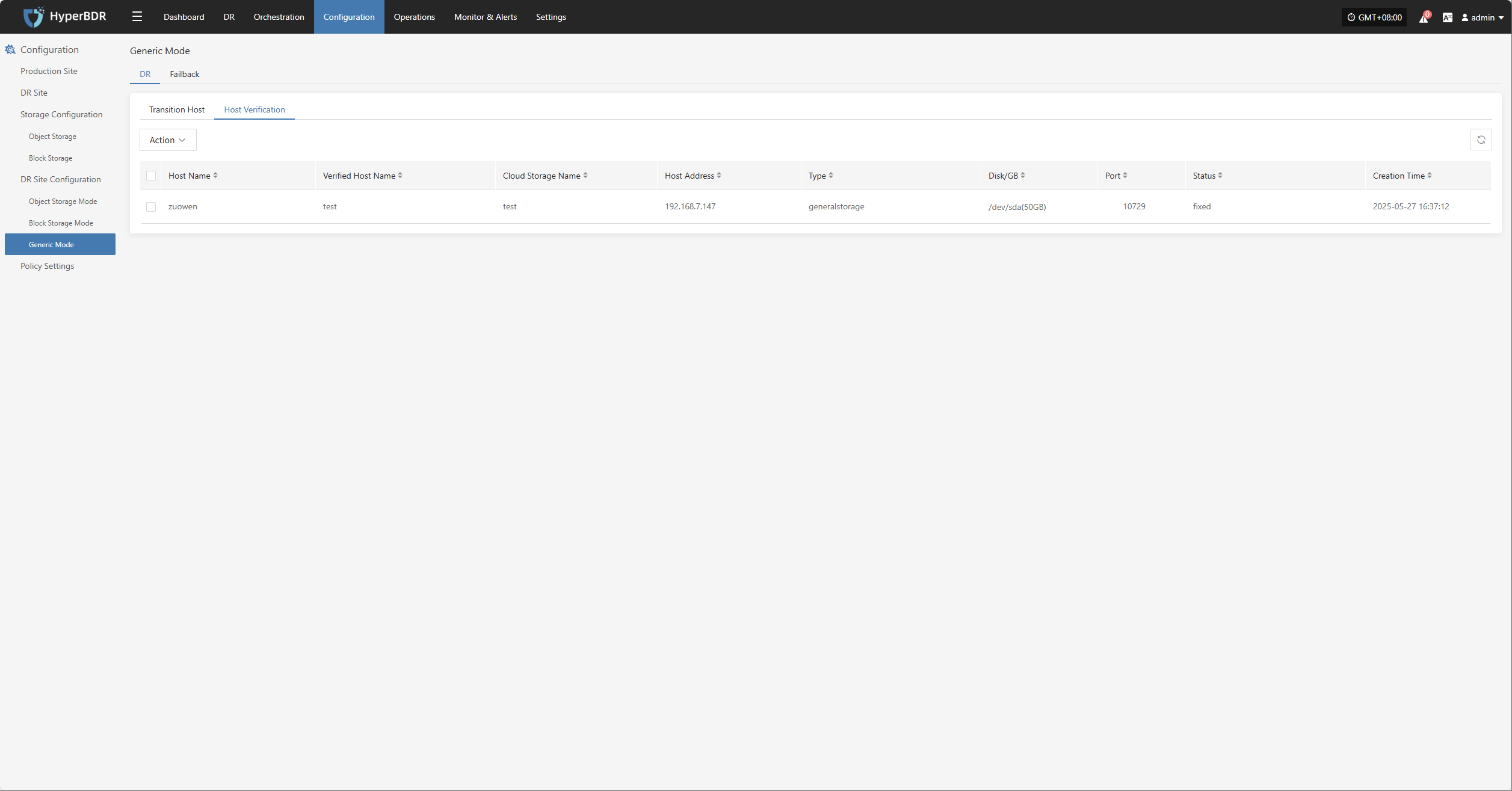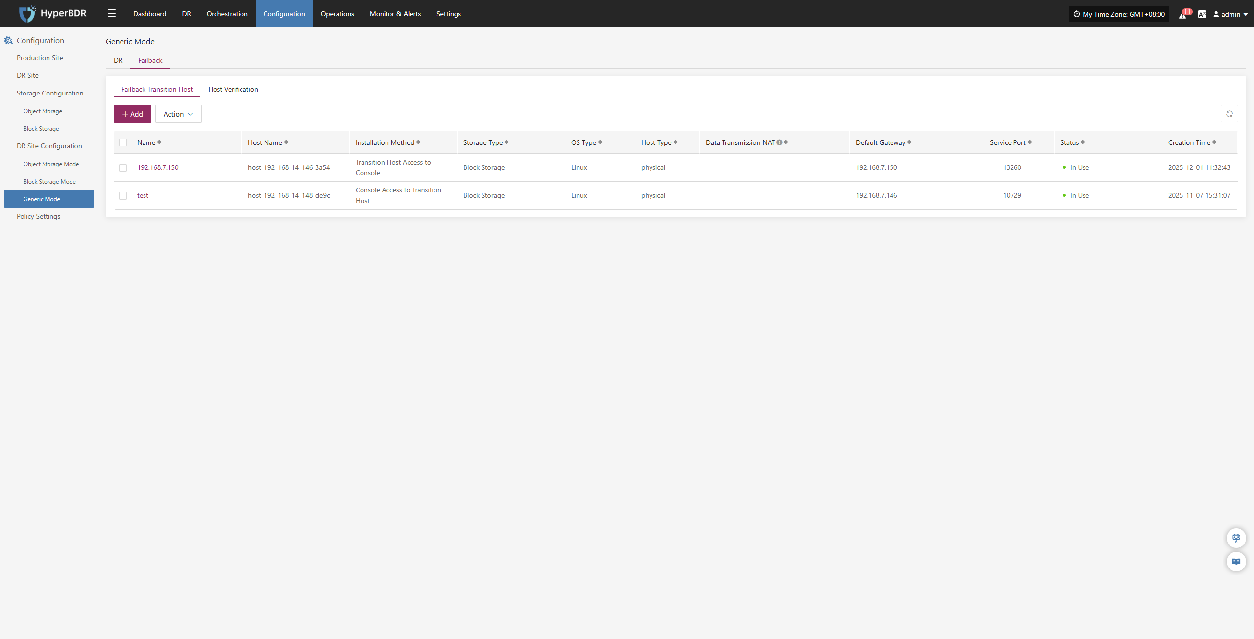 The top navigation bar provides quick access to the main system modules, including: Dashboard, DR, Orchestration, Configuration, Operations, Monitor & Alerts, Settings.