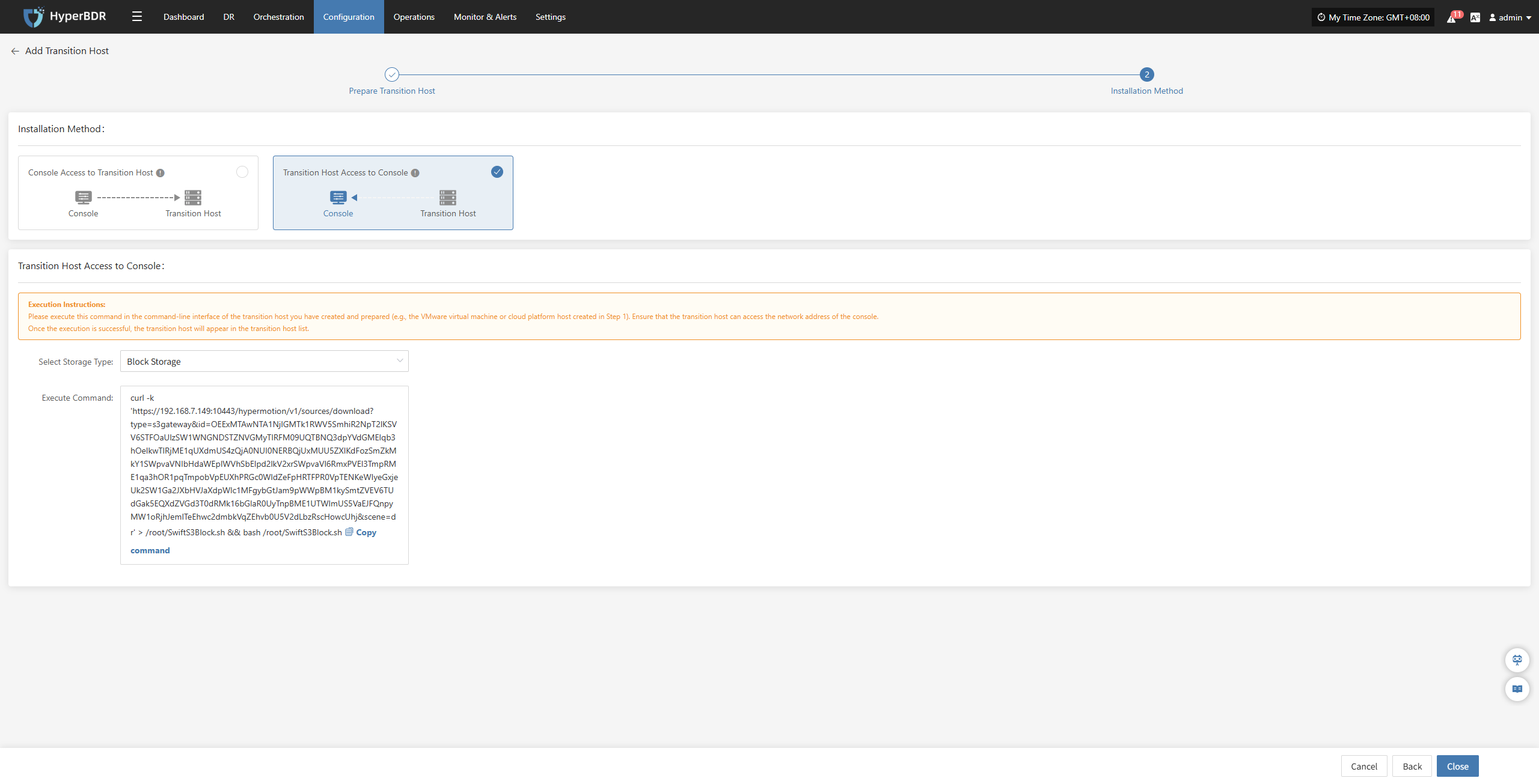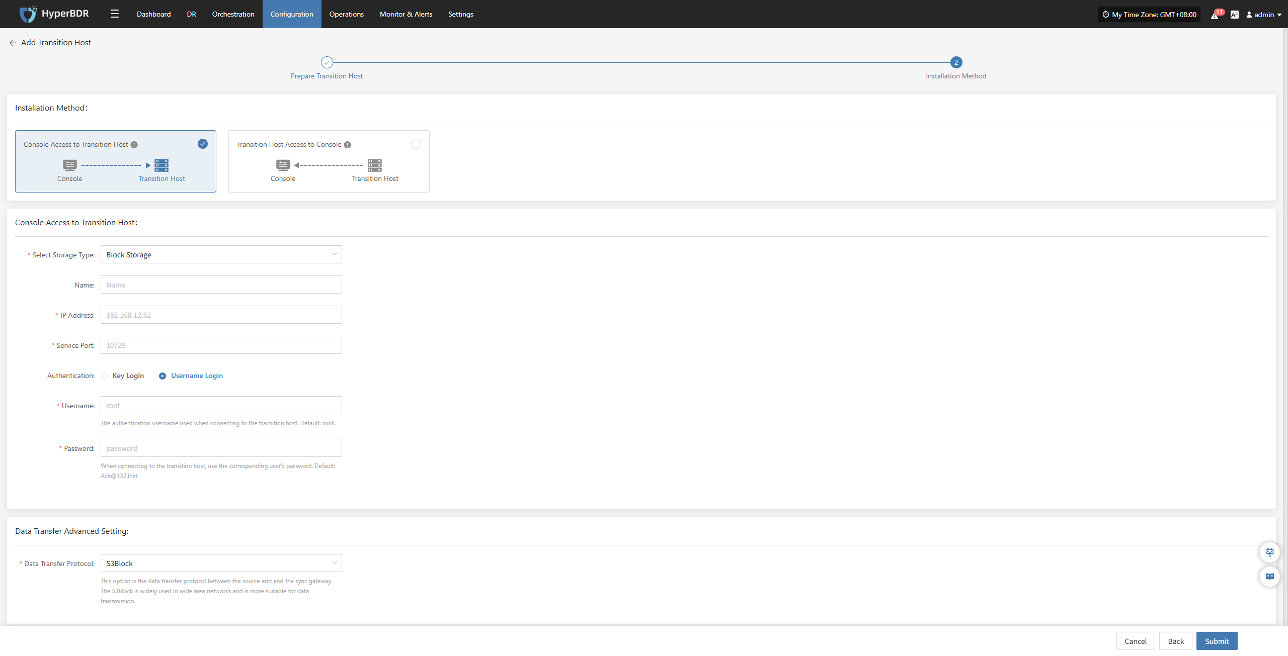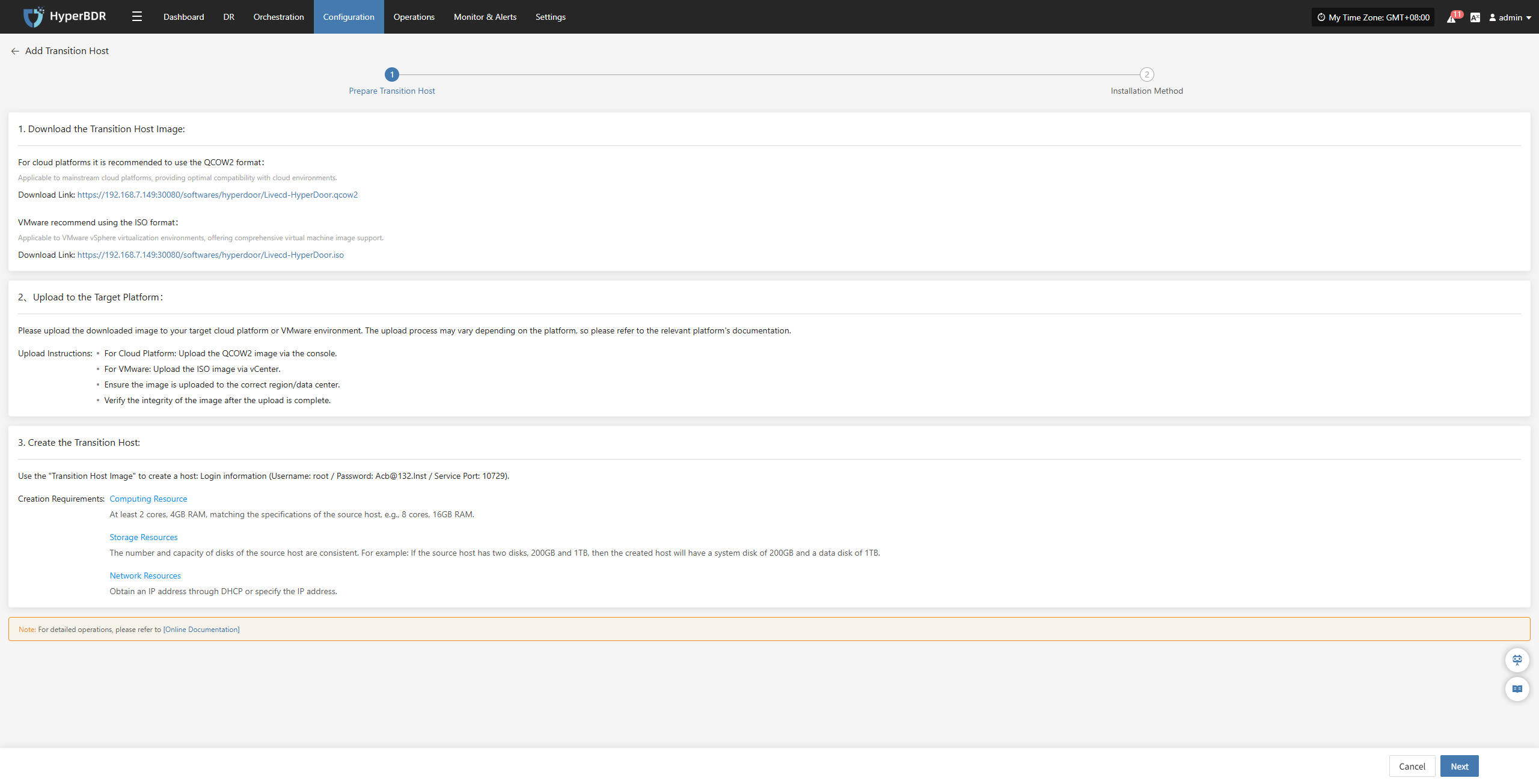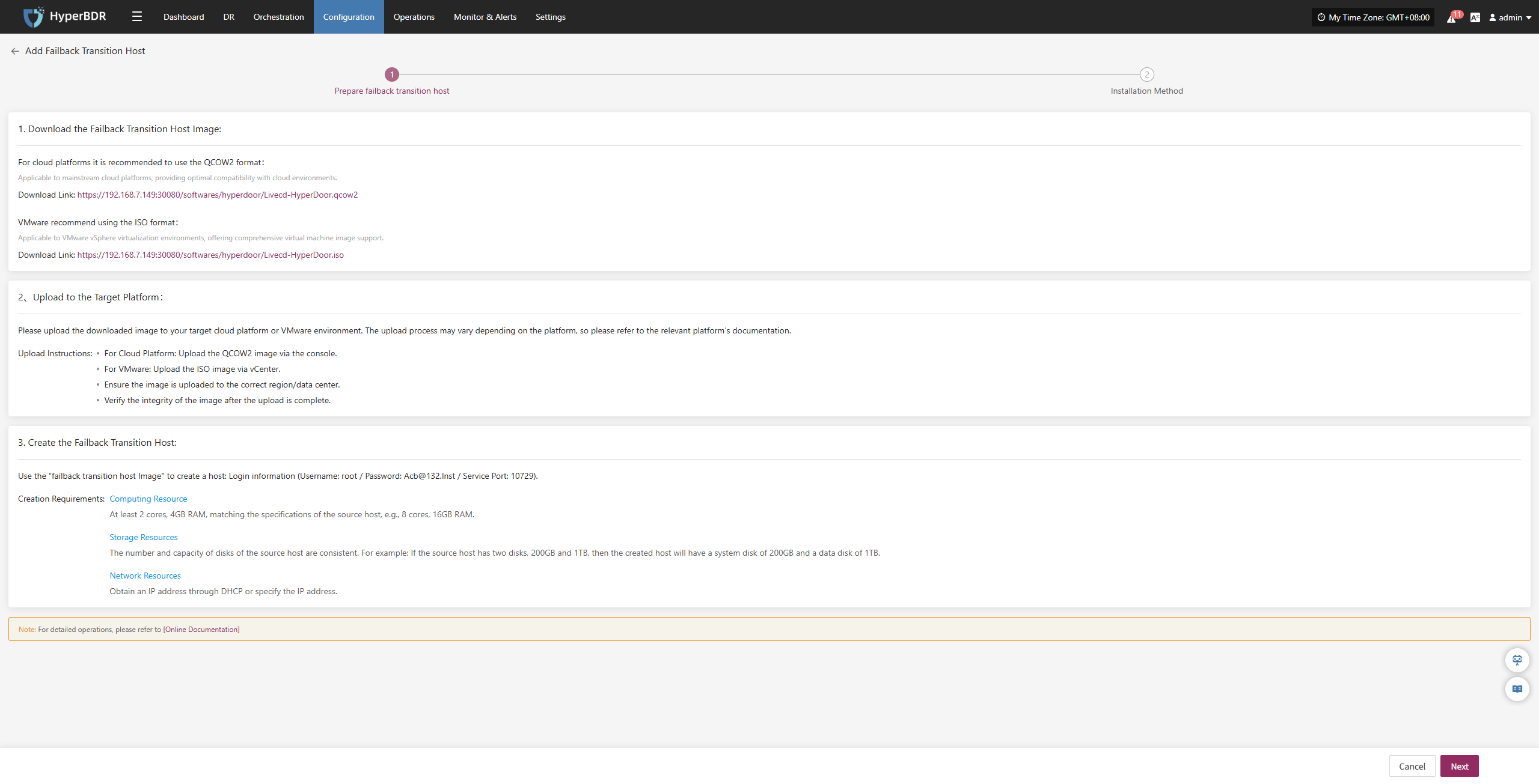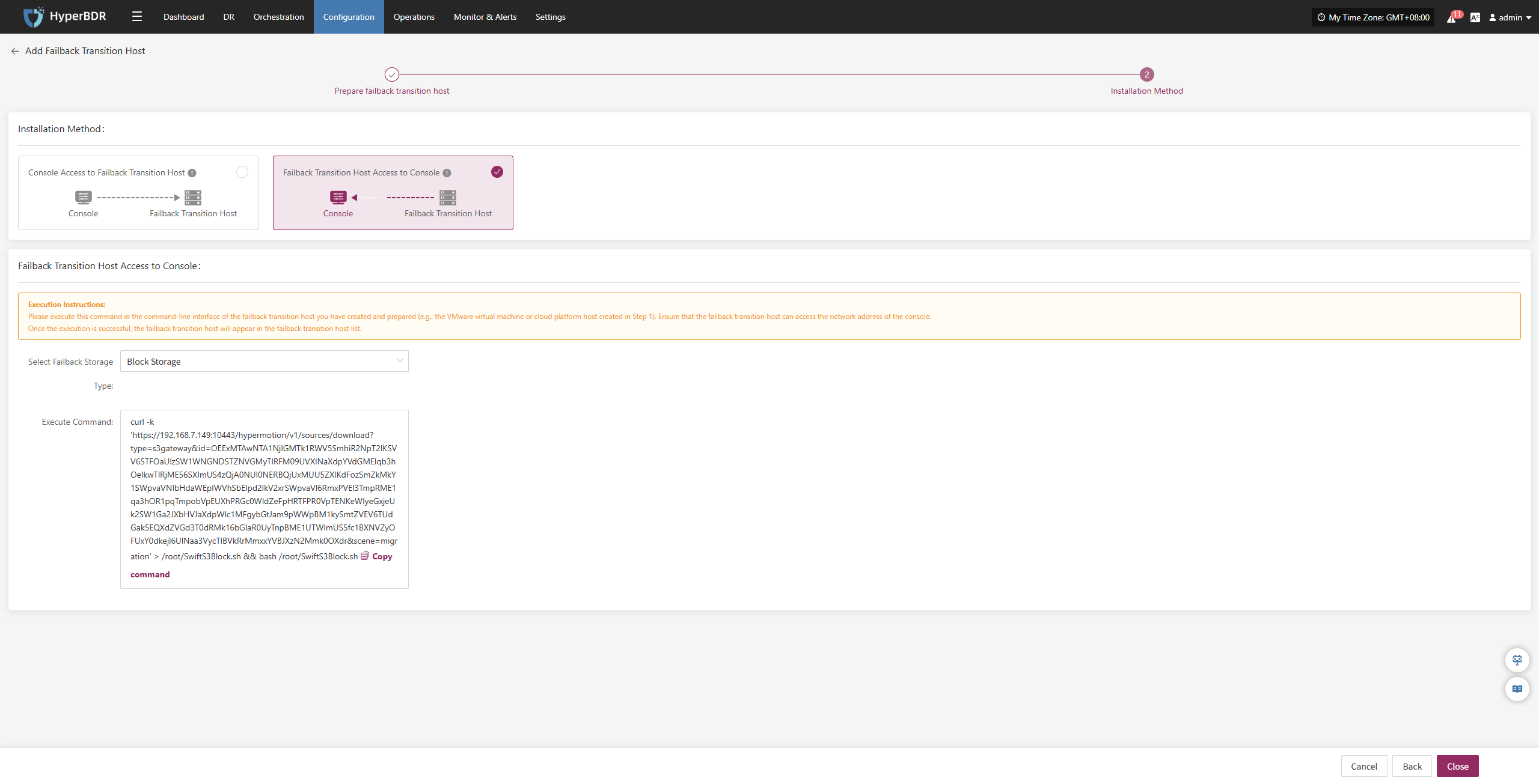 The top navigation bar provides quick access to the main system modules, including: Dashboard, DR, Orchestration, Configuration, Operations, Monitor & Alerts, Settings.