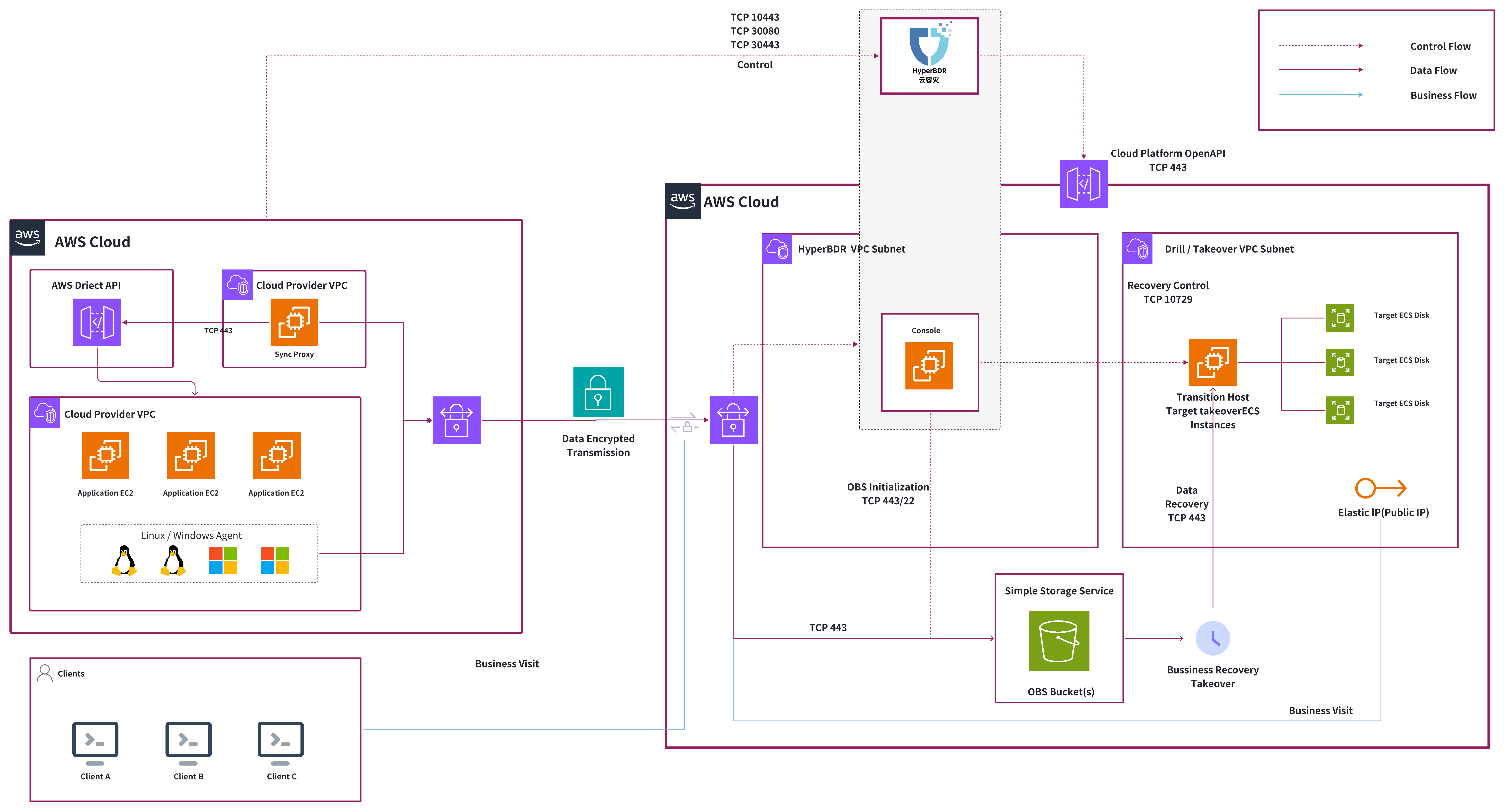 | Control Plane | HyperBDR Control Platform | EC2 c6i.2xlarge(8C16G)+ 500 GB EBS | DR Side / Cloud | Centralized Management and Control | Provides unified policy configuration, task scheduling, and DR takeover capabilities, without directly participating in large-scale data transfer |