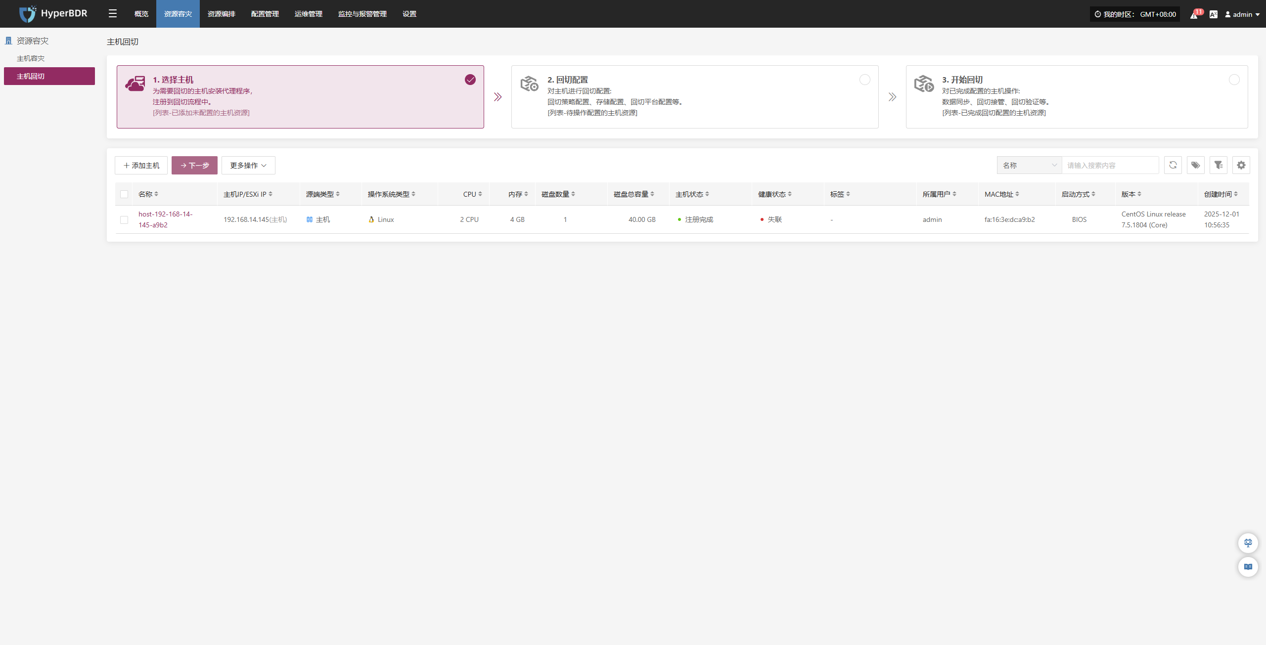 点击右下角“详情”按钮,可跳转至“开始容灾”页面,选择目标主机并关联相应策略。