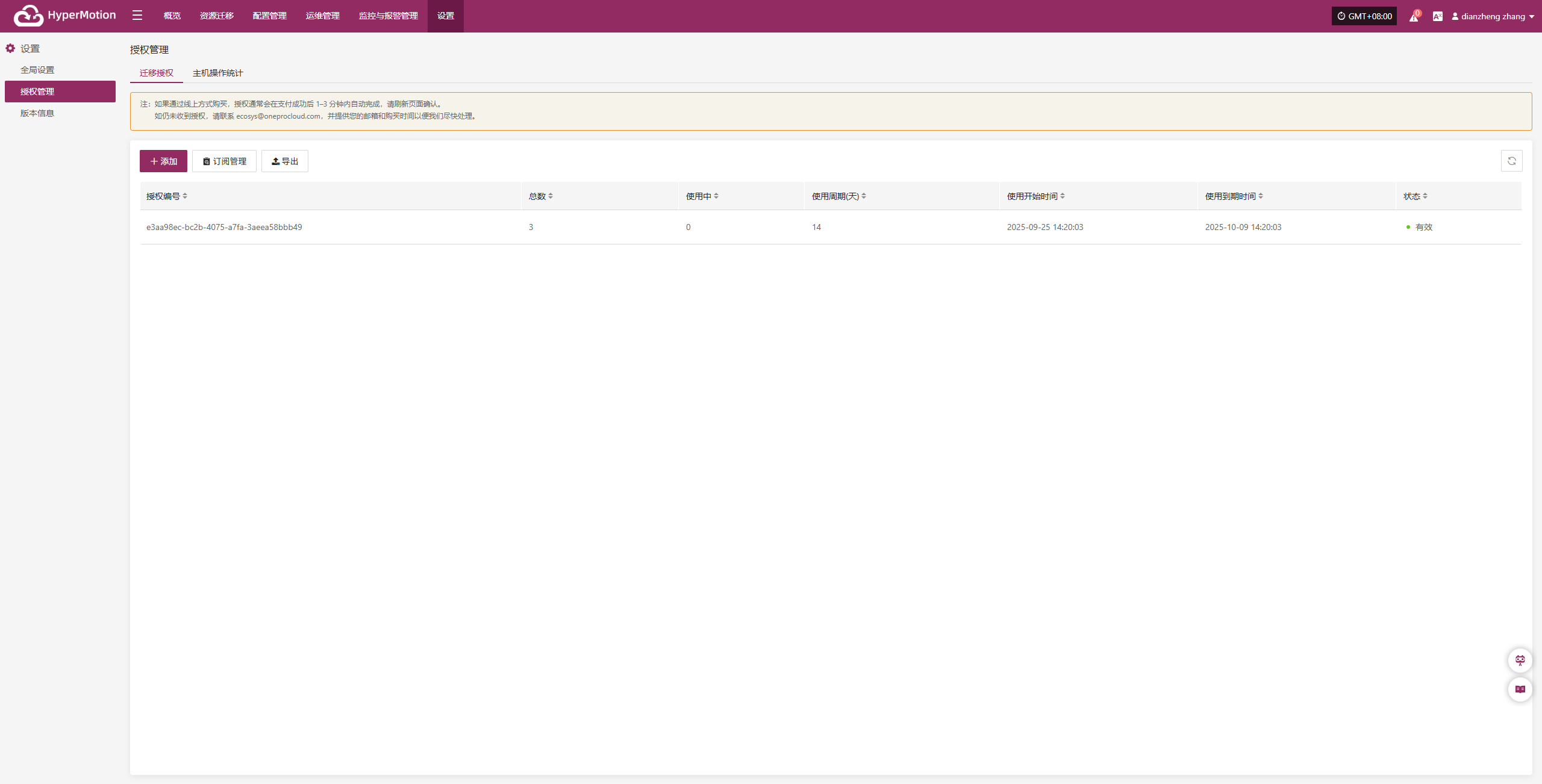 - 登录控制台后,依次点击上方导航栏的“设置” > “授权管理” > “迁移授权”,进入授权管理页面。